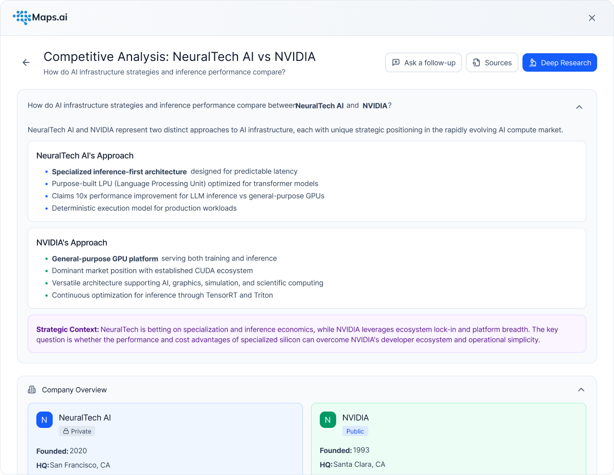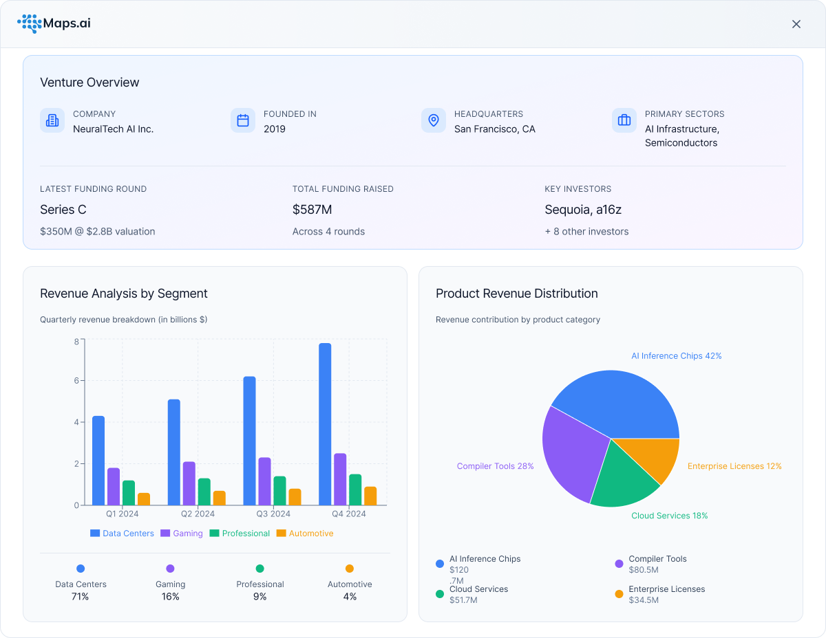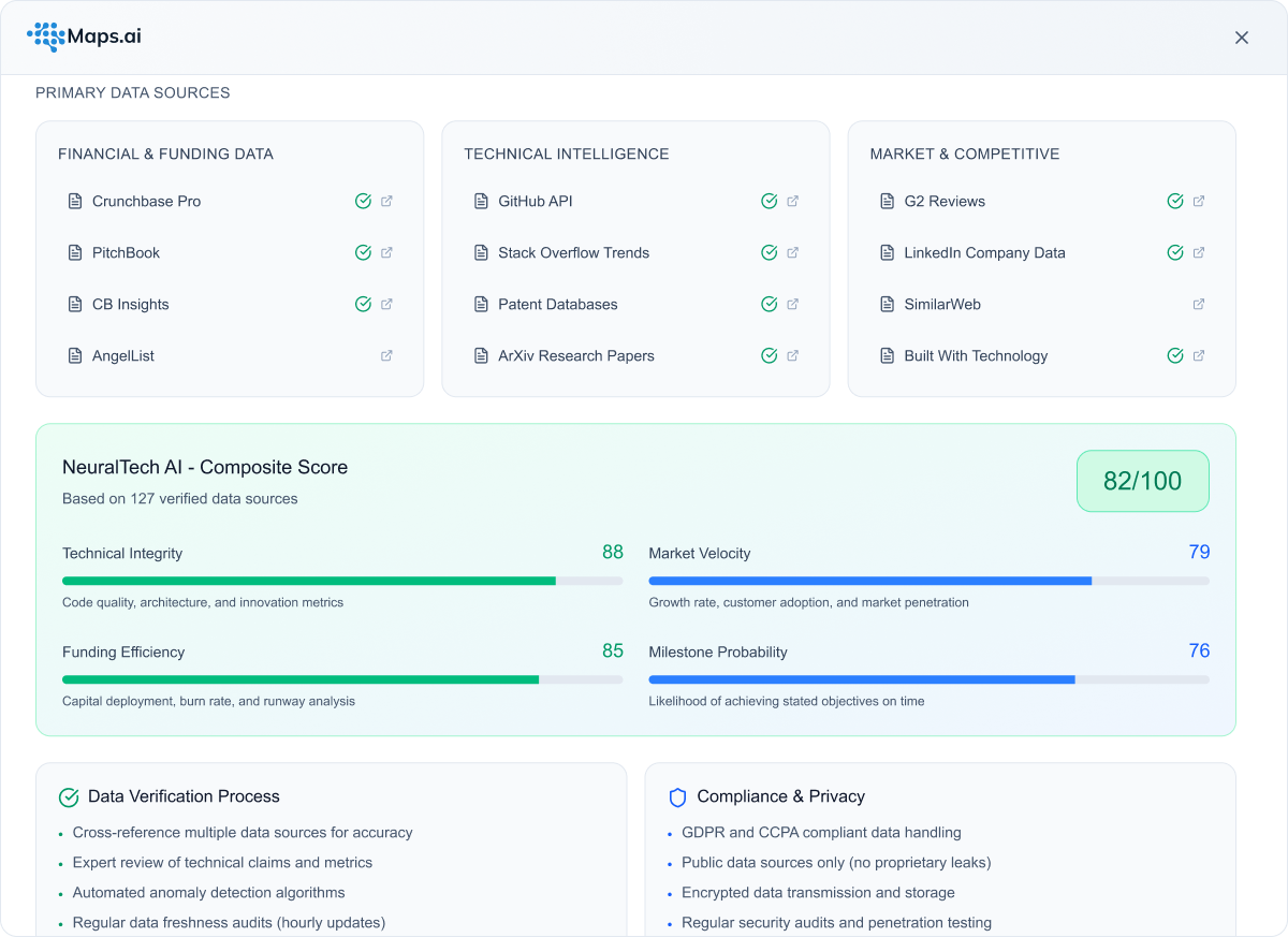 In a world where markets move faster than traditional research can keep up, Maps.ai provides the clarity needed to lead. We are a market intelligence platform designed to map the future in real-time. By continuously indexing emerging technologies, startup ecosystems, and macro-economic signals across every geography, we help leaders see around corners.